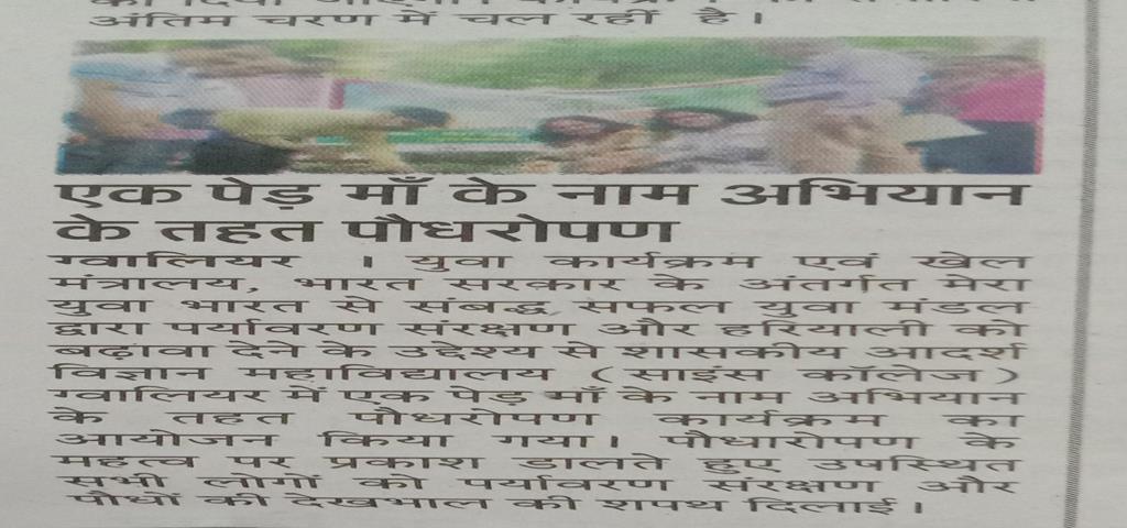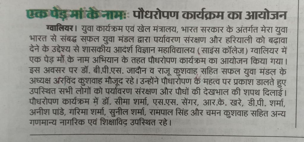 युवा कार्यक्रम एवं खेल मंत्रालय, भारत सरकार के अंतर्गत मेरा युवा भारत (MY Bharat) से संबद्ध सफल युवा मंडल द्वारा पर्यावरण संरक्षण और हरियाली को बढ़ावा देने के उद्देश्य से शासकीय आदर्श विज्ञान महाविद्यालय (साइंस कॉलेज), ग्वालियर में एक पेड़ मां के नाम अभियान के तहत पौधारोपण कार्यक्रम का सफल आयोजन किया गया।