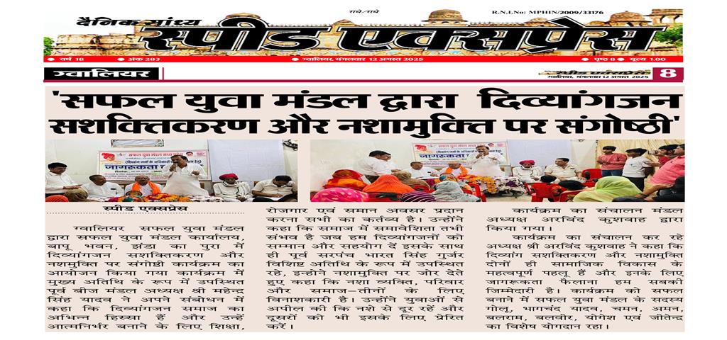 ग्वालियर 8 अगस्त, सफल युवा मंडल द्वारा सफल युवा मंडल कार्यालय, बापू भवन, झंडा का पुरा में दिव्यांगजन सशक्तिकरण और नशमुक्ति पर संगोष्ठी कार्यक्रम का आयोजन किया गया कार्यक्रम में मुख्य अतिथि के रूप में उपस्थित पूर्व बीज मंडल अध्यक्ष श्री महेन्द्र सिंह यादव ने अपने संबोधन में कहा कि दिव्यांगजन समाज का अभिन्न हिस्सा हैं और उन्हें आत्मनिर्भर बनाने के लिए शिक्षा, रोजगार एवं समान अवसर प्रदान करना सभी का कर्तव्य है। उन्होंने कहा कि समाज में समावेशिता तभी संभव है जब हम दिव्यांगजनों को सम्मान और सहयोग दें इसके साथ ही पूर्व सरपंच भारत सिंह गुर्जर विशिष्ट अतिथि के रूप में उपस्थित रहे, इन्होने नशामुक्ति पर जोर देते हुए कहा कि नशा व्यक्ति, परिवार और समाज—तीनों के लिए विनाशकारी है। उन्होंने युवाओं से अपील की कि नशे से दूर रहें और दूसरों को भी इसके लिए प्रेरित करें।